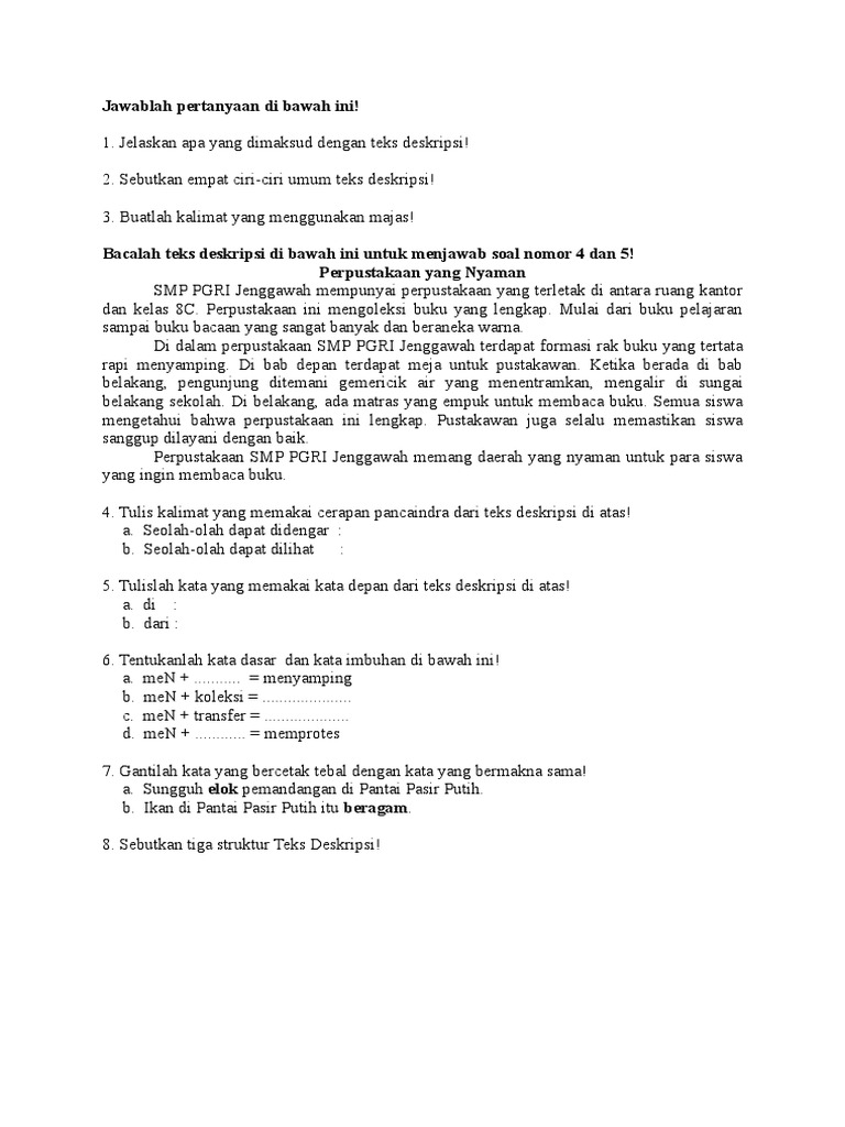 Anima merupakan salah satu sifat kemahakuasaan yang dimiliki oleh ida sang hyang widhi wasa yang sangat halus bagaikan kehalusan atom yang susah dilih. Panca indra merupakan organ akhir yang di khususkan buat menerima segala macam jenis rangsangan tertentu. Begitu manis, tak sedikitpun masam terasa di seratnya. Huruf kapital tidak digunakan pada nama jabatan yang tidak disertai oleh nama orang dan tidak mengacu pada bentuk yang lengkap. Banyak sekali hasil kerajinan dari indonesia dikirim ke luar negeri. .cerapan panca indra, penggunaan sinonim, penggunaan kata depan, penggunaan kata 1. Menggunakan kaidah dalam tata bahasa yang normatif. Penggunaan pilihan kata yang bervariasi teks deskripsi menggunakan kosakata secara segar dengan variasi kata yang luas. Nanti kalau diteruskan angka 21 ( jumlah dari tiga aspek di atas) nanti akan ketemu pada arah timur jadi kalau melepas ayam harus dari sebelah timur menghadap ke barat. Rasa hangat berbaur dengan lembutnya hembusan angin sore, melingkupi seluruh tubuh. Tulislah dua kalimat yang menggunakan majas pada teks di atas! Hijau lepas memandang, penuh daun dan pohon rindang. Kalimat utama merupakan kalimat yang diperjelas oleh kalimat yang lainnya dalam sebuah paragraf.